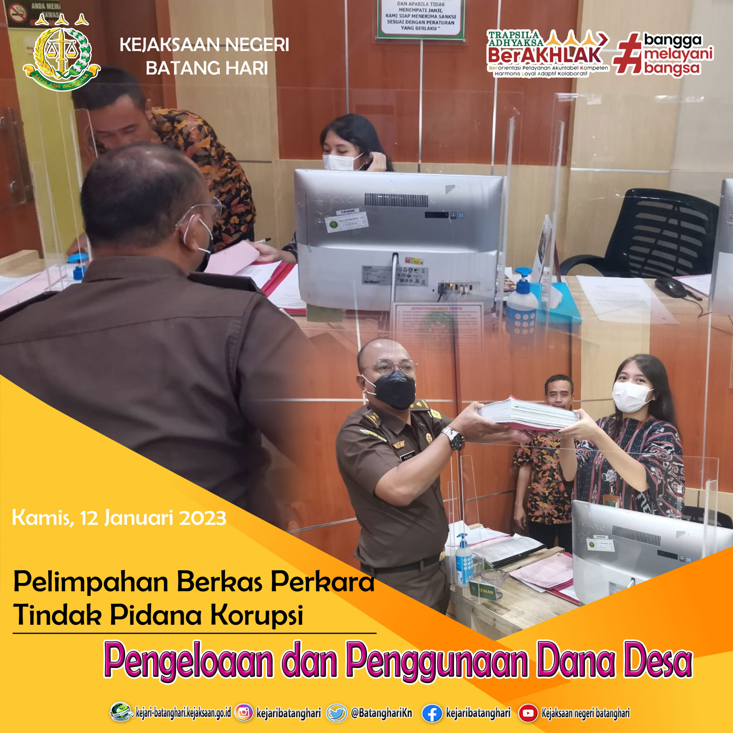 Jaksa Penuntut Umum (JPU) pada Kejaksaan Negeri (Kejari) Batang Hari melimpahkan berkas perkara Dugaan Tindak Pidana Korupsi pada Pengelolaan dan Penggunaan Dana Desa Padang Kelapo Kec. Maro Sebo Ulu Kab. Batang Hari pada item Pekerjaan Kegiatan Pembangunan Rehabilitasi Peningkatan Fasilitas jamban Umum / MCK umum Desa Padang Kelapo TA. 2021.