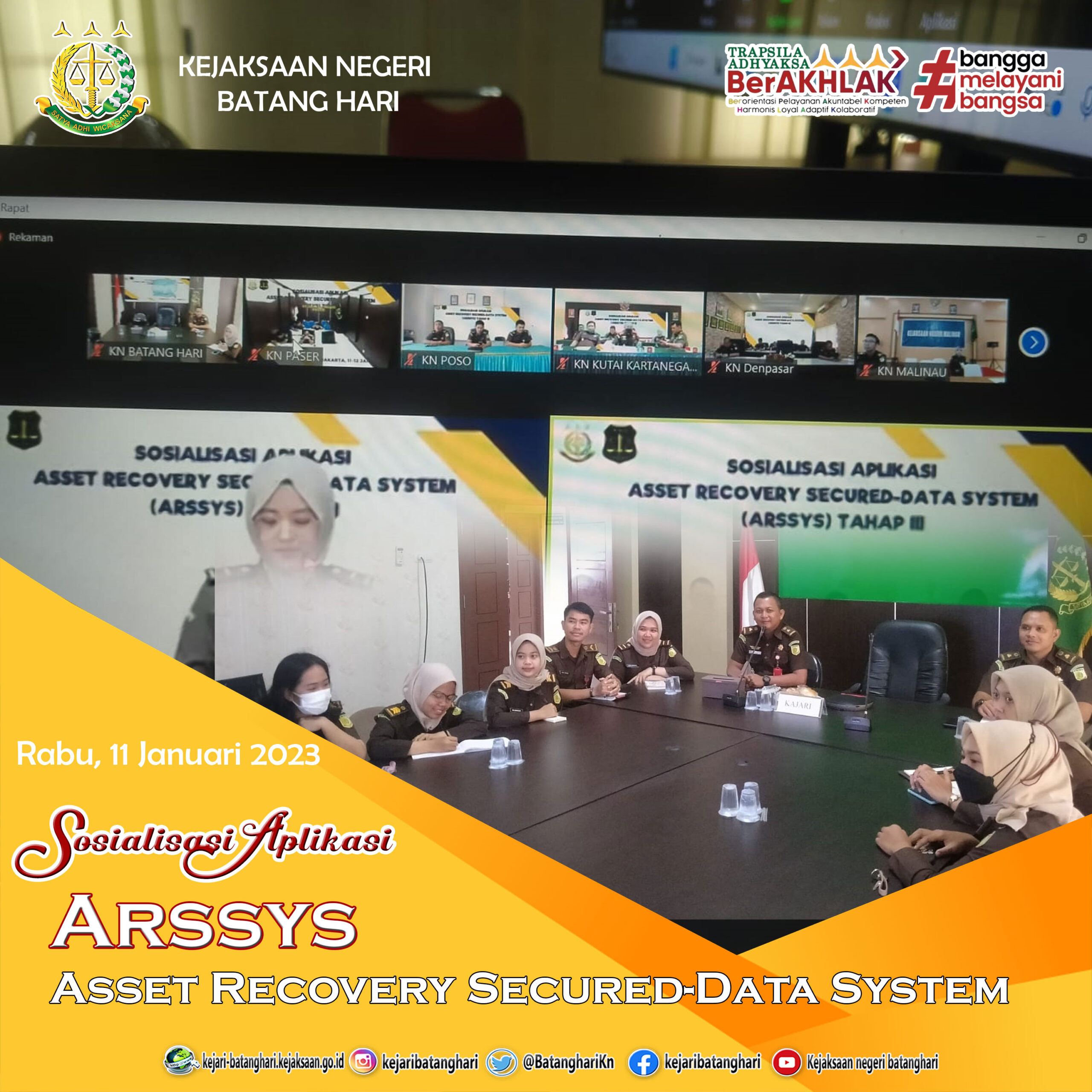 Rabu, 11 Januari 2023 bertempat di Aula Rapat Kejaksaan Negeri Batang Hari telah dilaksanakan Kegiatan Sosialisasi Aplikasi Asset Recovery Secured-Data System (ARSSYS).